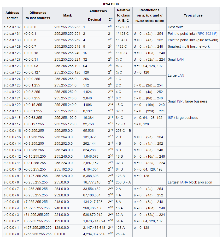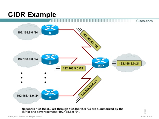 Các mạng CIDR còn được biết như là mạng “slash x” – x đại diện cho số bit trong phần network của địa chỉ IP. Chẳng hạn lớp C là mạng slash 24 – InterNIC là tổ chức quản lý 24 bit đầu tiên (trong 32 bit của địa chỉ Ipv4), và 8 bit còn lại có thể được dùng để cấp phát.
