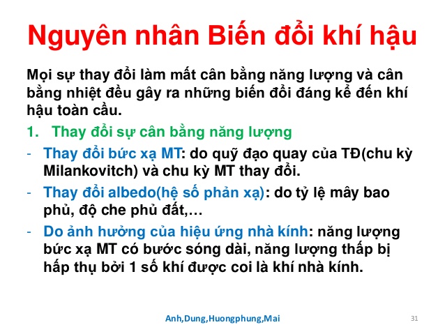 Những nhân tố có thể hình thành sự Climate Change là gì; chúng được xác định là do thay đổi bức xạ khí quyển bao gồm: biến đổi bức xạ mặt trời, độ lệch quỹ đạo của Trái Đất, kiến tạo núi, kiến tạo trôi dạt lục địa, sự thay đổi nồng độ khí nhà kính chủ yếu là khí thải CO2, CH4, N2O, HFCs, PFCs và SF6 của các nước công nghiệp phát triển gây hại, suy giảm thậm chí đã làm thủng tầng Ô-Zôn.