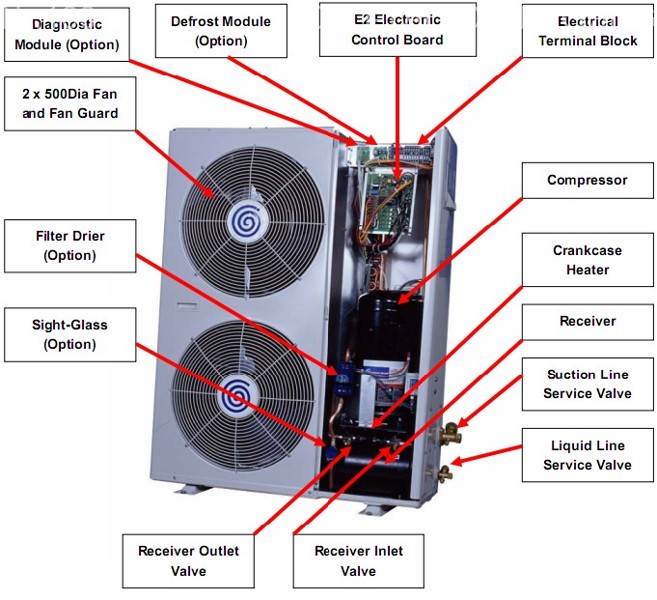 Hệ thống làm lạnh không khí gồm có một máy nén khí bơm gas áp suất cao đến dàn nóng (outdoor), tại đây khí gas sẽ tỏa nhiệt với môi trường ngoài nhờ quạt gió (gia dụng) hay nước (công nghiệp), hoặc bình ngưng.
