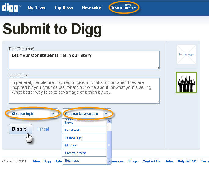 Khi bắt gặp trang web hay, muốn chia sẻ, bạn thực hiện theo tác gửi URL cùng một đoạn mô tả ngắn thông qua trang web xã hội Digg. Những người cùng sử dụng Digg sẽ thấy được thông tin bạn chia sẻ, thực hiện dig hoặc bury thông tin đó.