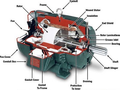 Phần chính của động cơ điện gồm phần đứng yên (stator) và phần chuyển động (rotor) được quấn nhiều vòng dây dẫn hay có nam châm vĩnh cửu. Khi cuộn dây trên roto và stato được nối với nguồn điện, xung quanh nó tồn tại các từ trường, sự tương tác từ trường của rotor và stator tạo ra chuyển động quay của rotor quanh trục hay 1 mômen.
