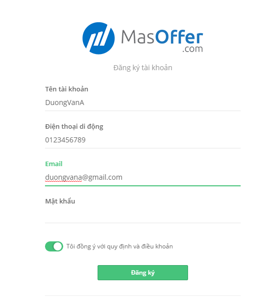 Bước 1: Truy cập vào trang pub.masoffer.com/sign-up. Điền đầy đủ thông tin vào các mục yêu cầu và ấn Đăng ký.