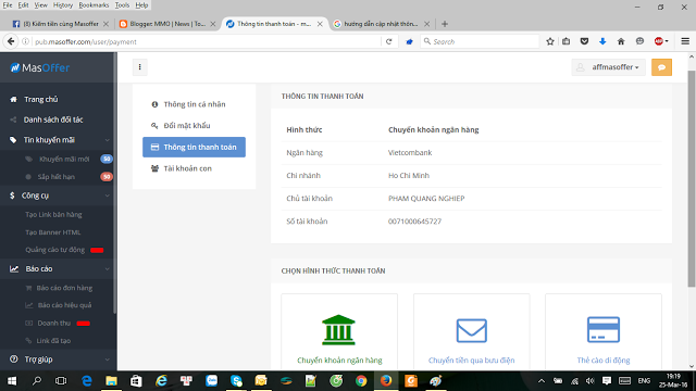 Lần đầu bạn vào MasOffer có hướng dẫn qua cho các bạn các mục cần thiết nên bạn có thể tìm hiểu cách dùng. Ngoài ra mình sẽ cố gắng dành 1 bài viết để hướng dẫn các bạn cách tạo link tiếp thị với MasOffer.