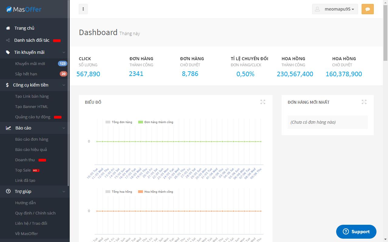 Điểm mình đánh giá cao nhất của MasOffer đó là giao diện người dùng trực quan, dễ sử dụng cùng với đó là hệ thống thống kê các số liệu rõ ràng (làm affiliate marketing quan trọng nhất là thống kê đơn hàng phải rõ ràng, minh bạch).