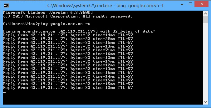 Ở đây mình sẽ ping đến website Google.com.vn vì sao phải thêm -t vào sau mỗi câu lệnh ? đó là vì nếu không thêm -t thì cmd sẽ chỉ trả về 3 kết quả kiểm tra và tự thoát để có thể xem được kết quả nhiều mà không bị tự thoát chúng ta thêm -t vào sau các câu lệnh kiểm tra.