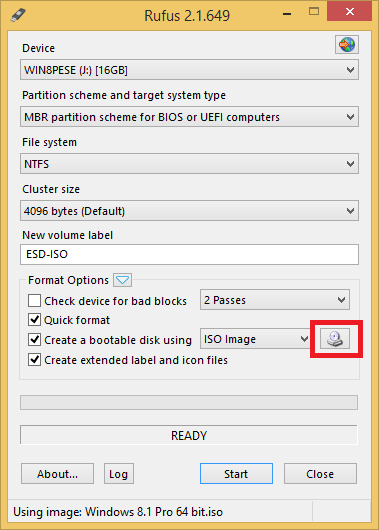 Bước 2: Mở Rufus lên, phần mềm sẽ nhận diện USB của bạn, trong trường hợp bạn đang cắm nhiều USB, hãy nhấn vào Device và chọn USB bạn muốn boot. Sau đó nhấp vào biểu tượng khoanh đỏ phía dưới.