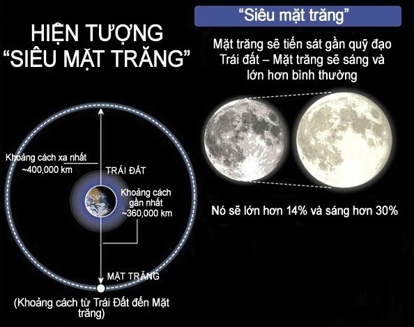 Trong một kỳ siêu trăng, Mặt trăng sẽ nằm ở vị trí gần Trái đất nhất, cách Trái đất khoảng 360.000km. Siêu trăng sẽ lớn hơn 14% và sáng hơn 30% so với khi Mặt trăng ở điểm xa Trái đất nhất trên quỹ đạo của nó.