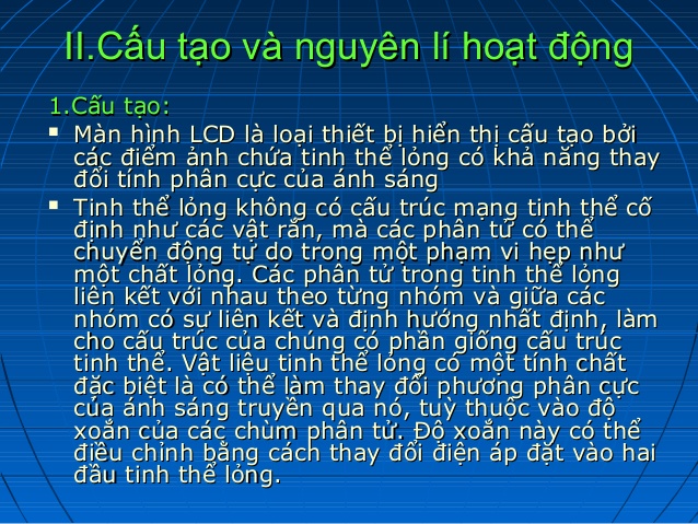 Kết Luận: "Màn hình tinh thể lỏng" hay "LCD" (Liquid crystal display) là "loại thiết bị hiển thị cấu tạo bởi các tế bào (các điểm ảnh) chứa tinh thể lỏng có khả năng thay đổi tính phân cực của ánh sáng và do đó thay đổi cường độ ánh sáng truyền qua khi kết hợp với các kính lọc phân cực". Chúng có ưu điểm là phẳng, cho hình ảnh sáng, chân thật và tiết kiệm năng lượng.