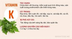 "Vitamin K" là "một nhóm các vitamin hòa tan trong chất béo, giống nhau về cấu trúc, có vai trò quan trọng trong sự điều chỉnh sự đông đặc của máu". Vitamin K là cần thiết hỗ trợ sự đông máu.Vitamin K hỗ trợ sự trao đổi chất của xương và trao đổi chất của canxi trong hệ thống mạch máu.
