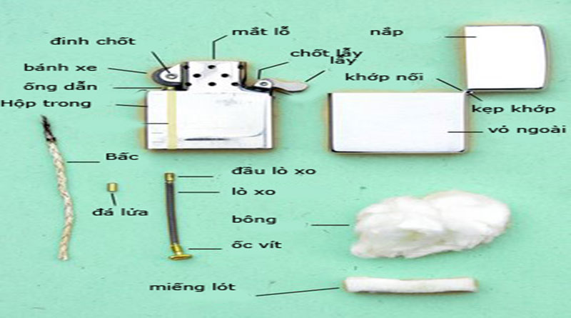 Quan sát chiếc bật lửa zippo thì chúng ta thấy chúng có cấu tạo bật lửa zippo đơn giản nhưng thực ra là có rất nhiều chi tiết. Cấu tạo cơ bản bật lửa zippo gồm có vỏ ngoài và ruột bên trong, trong ruột bật lửa zippo có bông để giữ xăng- một loại xăng dành riêng cho bật lửa zippo, nối với ruột là bấc. Bấc được để trong một miếng thép chắn gió, đây là lí do bật lửa zippo có thể cháy được trong gió hoặc các điều kiện thời tiết khắc nhiệt..