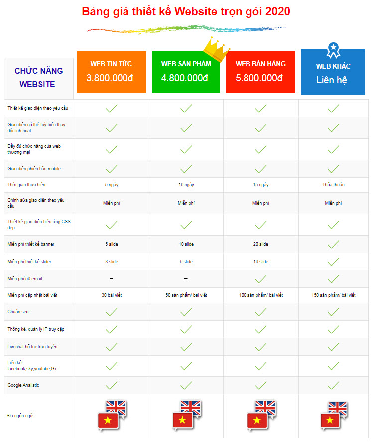 Đến với VietWeb, mọi khách hàng đều có thể chọn lựa tiêu chuẩn riêng cho trang web của mình sao cho phù hợp với công việc, ngành nghề, chi phí, sở thích,…Cụ thể, VietWeb cung cấp 3 gói dịch vụ thiết kế web như sau: