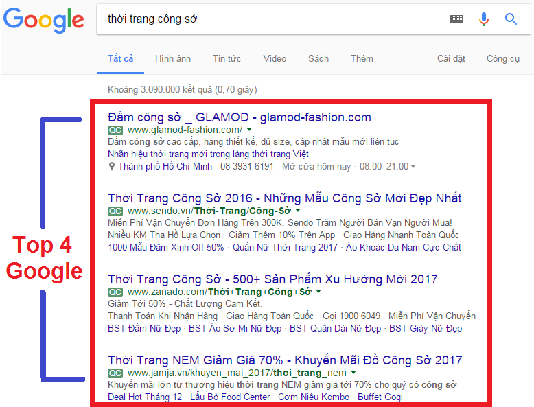 - Website của bạn sẽ lên top Google nhanh chóng chỉ trong vài giờ đồng hồ. Giá quảng cáo Google dựa vào chi phí và cách bạn tối ưu mẫu quảng cáo theo yêu cầu của phía Google để xếp hạng cho bạn cao hơn đối thủ.