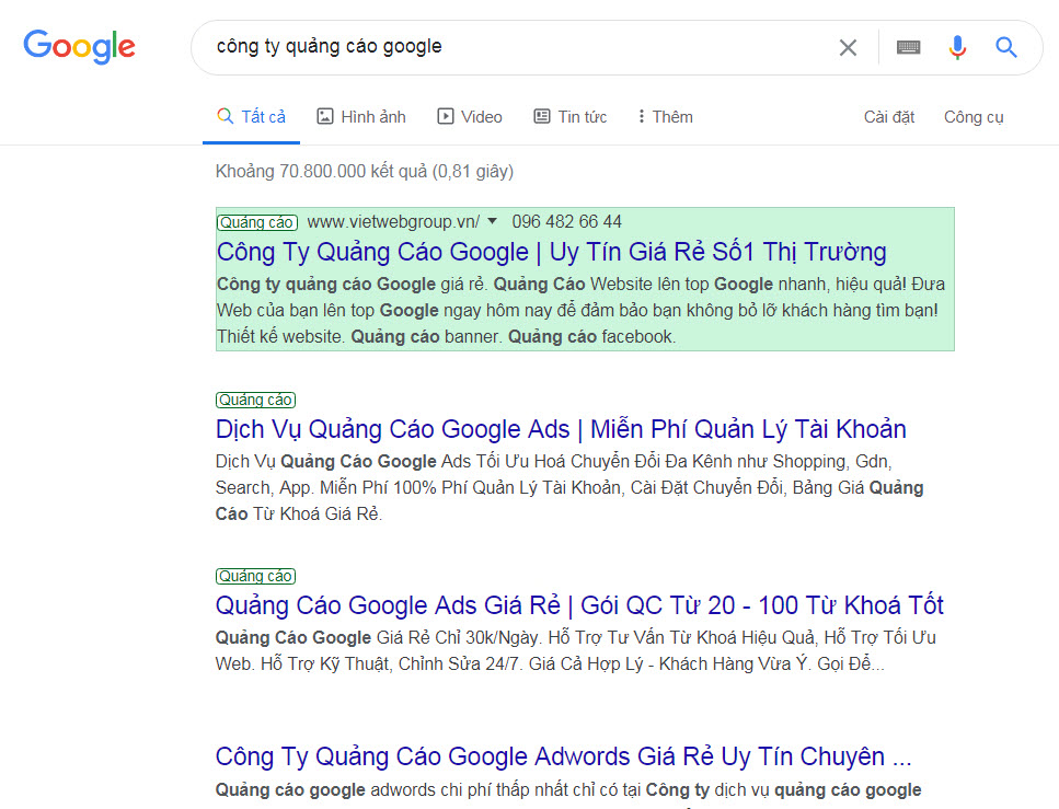 Google là công cụ tìm kiếm hữu ích hàng đầu của thế giới. Ở Việt Nam gần như 99% người dùng internet sử dụng Google để tìm kiếm thông tin trên internet của mình. Chính vì vậy, quảng cáo Google (hay còn gọi Google AdWords) đang được cá nhân, doanh nghiệp sử dụng để việc kinh doanh trực tuyến nhanh và đạt hiệu quả tối đa. Công ty quảng cáo Google VietWeb rất hân hạnh đem đến cho quý vị dịch vụ Quảng cáo Google công ty xuất khẩu với những tính năng nổi bật nhất.