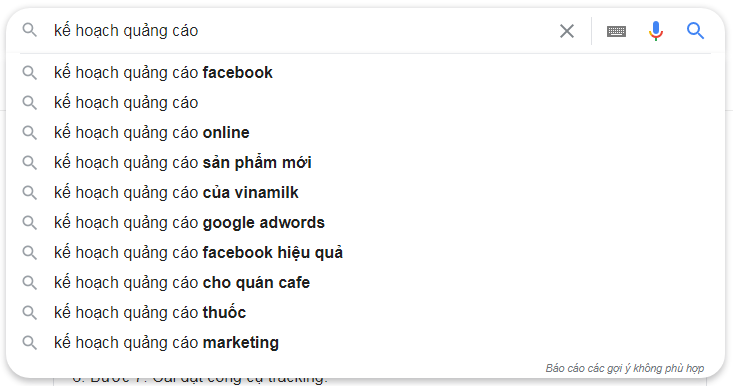Bạn nhập từ khóa vào ô tìm kiếm của Google và Google sẽ trả về danh sách các từ khóa liên quan