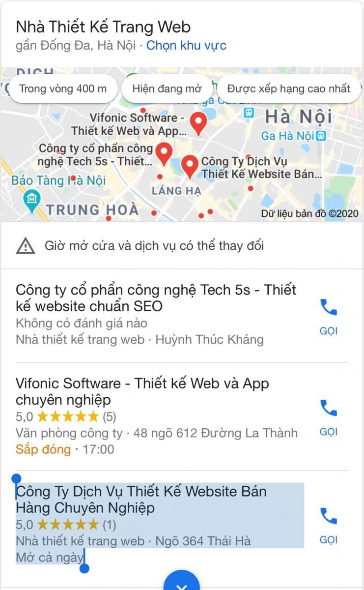 Thông qua quá trình tối ưu bản đồ doanh nghiệp, doanh nghiệp có cơ hội để xuất hiện trên 3 vị trí đầu tiên của Google Map. Tại đây khách hàng có thể thực hiện truy cập trực tiếp trang web hoặc sử dụng bản đồ chỉ đường hoặc có thể gọi điện trực tiếp cho doanh nghiệp.