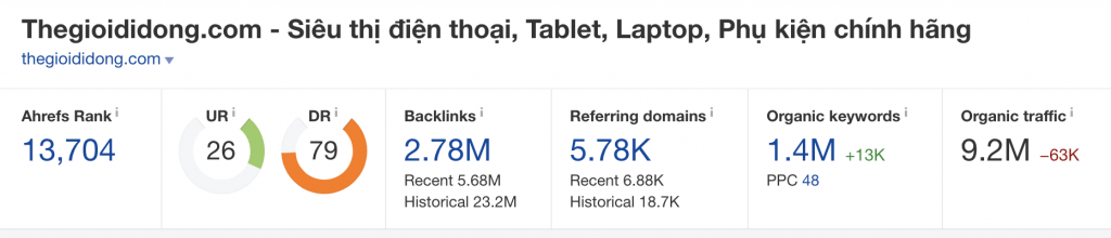 Nhìn qua biểu đồ thống kê dữ liệu từ Ahrefs về thegioididong.com bạn có thể thấy website này có tới 1400000 từ khóa được hiển thị trên bảng kết quả tìm kiếm của Google. Một con số thật tuyệt vời, đây cũng là kết quả nỗ lực của cả đội ngũ của thegioididong.com.