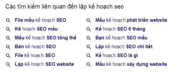 Ngoài ra bạn cũng có thể kiểm tra ở phía cuối trang kết quả tìm kiếm để thấy phần các tìm kiếm liên quan và có thể tham khảo tiếp những từ khóa gợi ý khácThông thường bạn sẽ nhận được thêm rất nhiều từ khóa mới và các từ khóa này có xu hướng là những từ khóa dài hơn, và có mức độ cạnh tranh thấp hơn so với từ khóa ngắn.