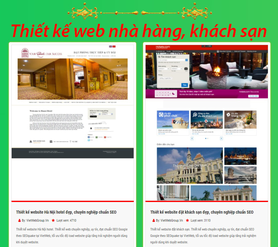 Thiết kế website nhà hàng, khách sạn là công cụ marketing hoàn hảo, tiết kiệm được khá lớn chi phí quảng cáo. Dịch vụ thiết kế website nhà hàng, khách sạn của VietWebGroup giúp nhà hàng gia tăng nhanh chóng lượng thực khách đặt bàn trực tuyến và nâng tầm thương hiệu.