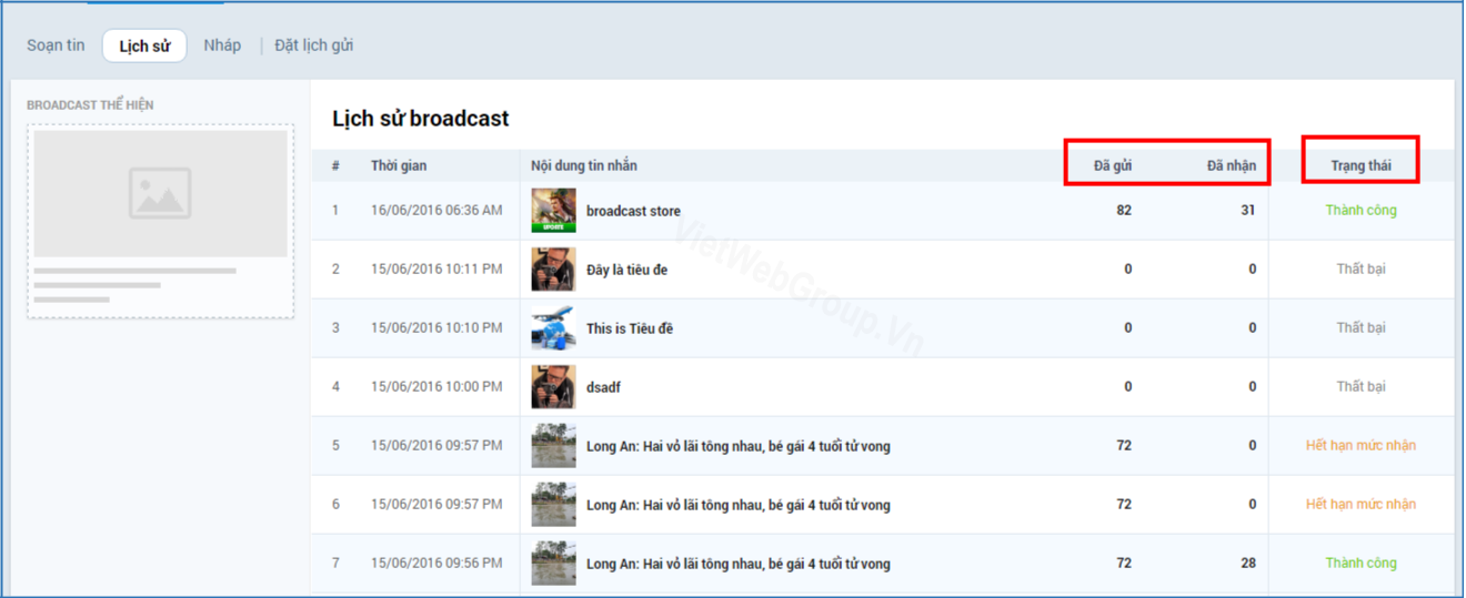 - Trạng thái : thể hiện tình trạng tin đã gửi thành công hay thất bại hoặc hết hạn mức gửi tin