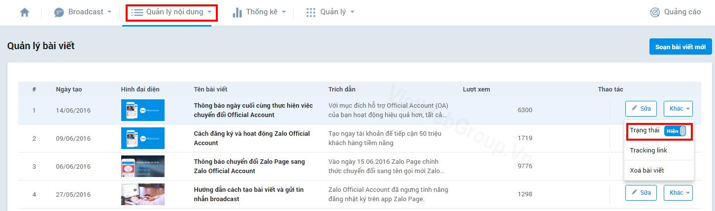 Ngoài chức năng quản lý bài viết đã tạo trong phần broadcast, Admin cũng có thể “soạn bài viết mới”trong phần quản lý nội dung.