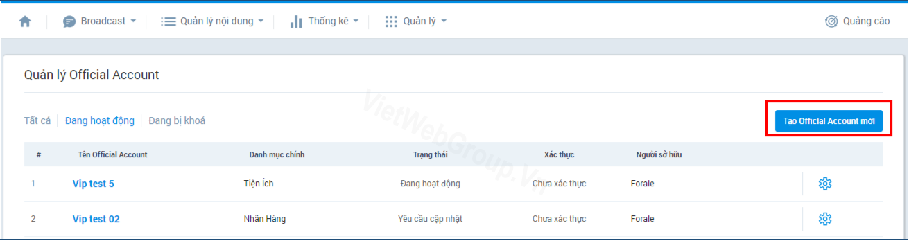 1.2 - Bước 2: Click vào “Tạo Official Account mới”