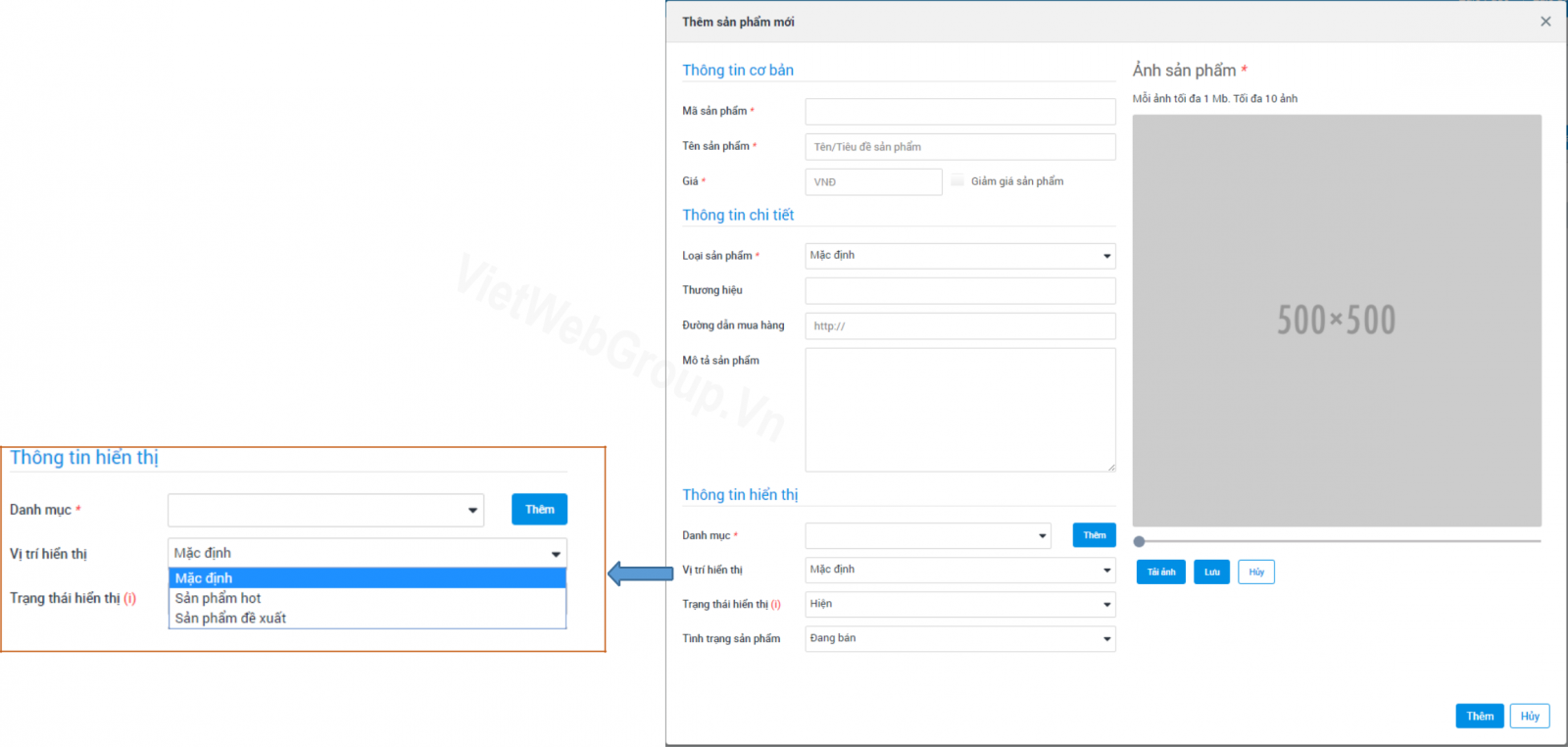 - Vi trí hiển thị: Mặc định, sản phẩm hot, sản phẩm đề xuất.