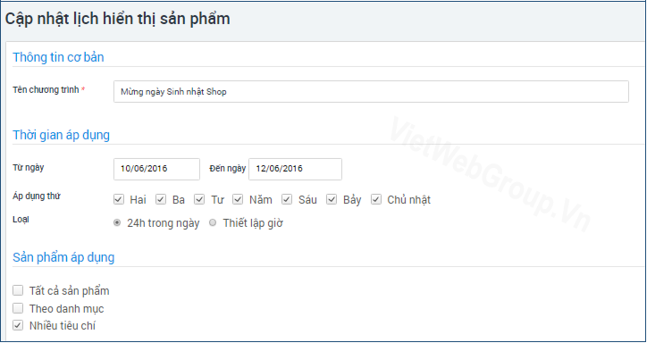 Nhằm thiết lập hiển thị một số sản phẩm trên giao diện trong một khoảng thời gian ngắn. Sau thời gian thiết lập sản phẩm sẽ trở về trang thái đã tạo ban đầu