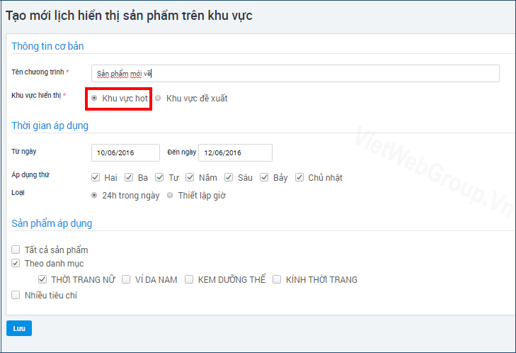 VD: Như nội dung trong hình thì trên phần khu vực hot sẽ hiển thị các sản phẩm trong danh mục thời trang nữ thời gian từ 10/6-12/6, các ngày trong tuần