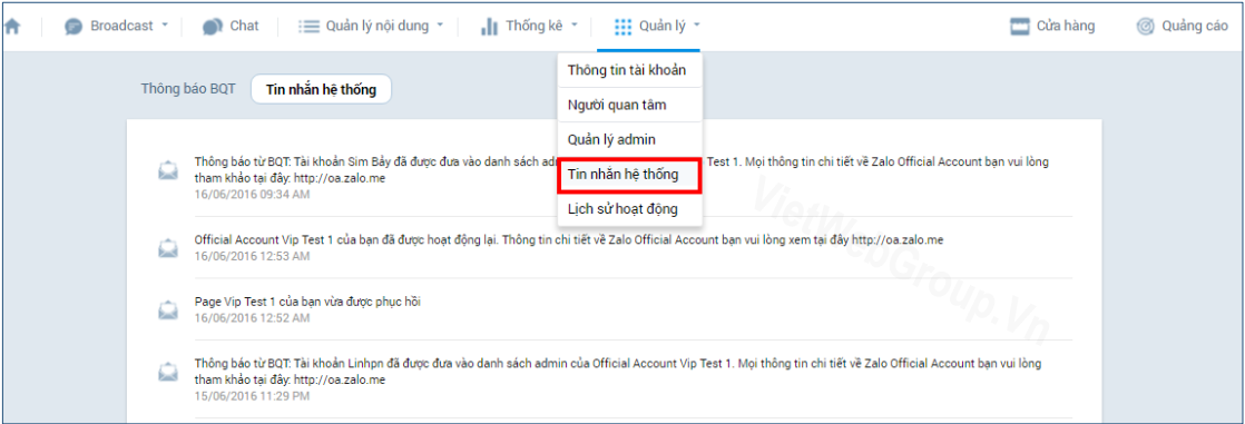 Hiển thị tất cả tin nhắn từ hệ thống đã gửi cho Admin OA