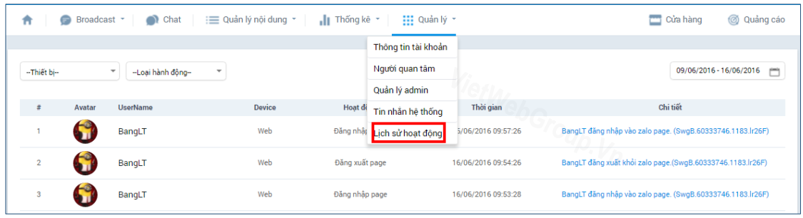 Lich sử hoạt động của OA: Lưu lại những hoạt động của Admin trong tool quản lý, check tất cả hoạt động, kiểm tra lịch sử theo từng thời điểm, và tìm kiếm theo từng Admin