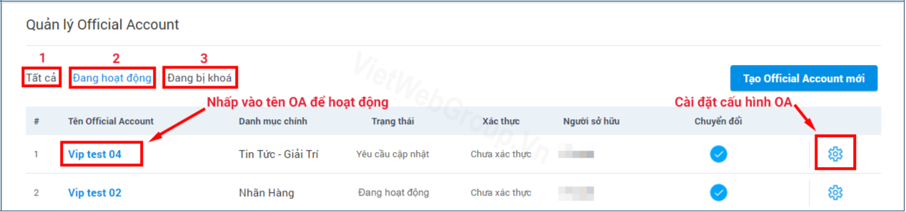 - Tất cả: các OA admin đã tạo, đang quản trị và OA bi khóa