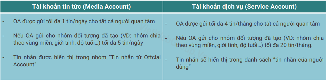 Tin nhắn Broadcast (Tin nhắn đến tất cả người dùng): Zalo Official Account có thể gửi tin nhắn đến tất cả người quan tâm, tùy theo từng loại tài khoản OA mà có từng giới hạn gửi tin khác nhau, cụ thể:
